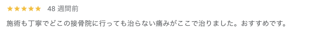 「施術も丁寧でどこの接骨院に行っても治らない痛みがここで治りました。おすすめです。」