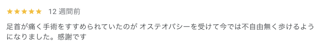 「足首が痛く手術をすすめられていたのがオステオパシーを受けて今では不自由無く歩けるようになりました。感謝です」
