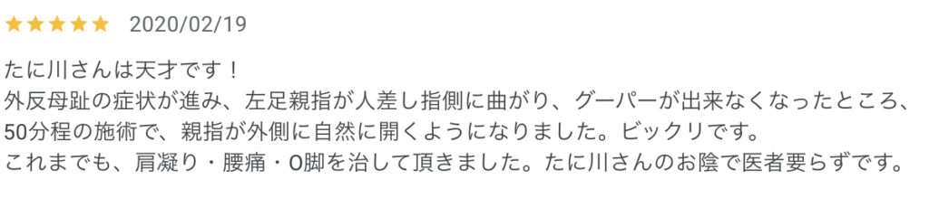 本当に感動レベルでした。次回はたに川さんの治療のために旅行計画予定です!」