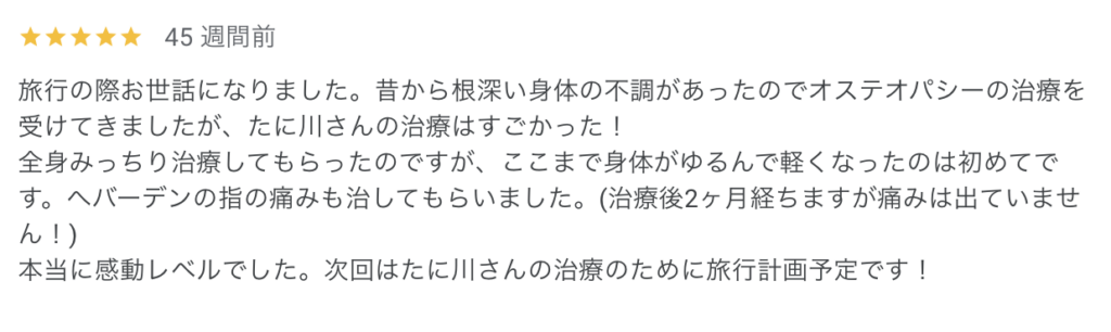 「旅行の際お世話になりました。昔から根深い身体の不調があったのでオステオパシーの治療を受けてきましたが、たに川さんの治療はすごかった!