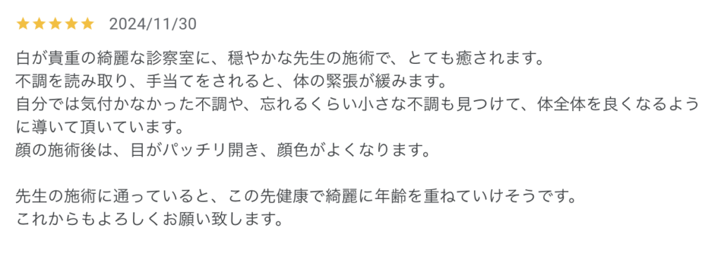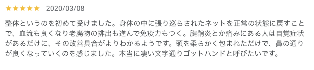 This is the first time I have had what is called Seitai. By returning the nets that are stretched throughout the body to their normal state, blood flow improves, waste products are eliminated, and immunity is strengthened. People who have tendonitis or pain seem to be able to understand the improvement more because they are aware of the symptoms. Just by having my head wrapped softly around him, I could feel the passage of my nose getting better. Truly amazing, I would literally call him the Got Hand."